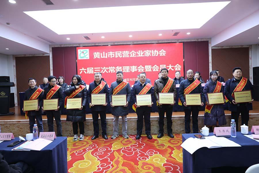 2024年1月26日下午,黃山市民營企業(yè)家協(xié)會六屆三次常務(wù)理事會暨會員大會在屯溪召開,我公司(副會長)參加了此次大會。會上表彰了10家“黃山市有突出貢獻(xiàn)的民營企業(yè)”和31位“黃山市優(yōu)秀民營企業(yè)家”,并舉行了授牌儀式。我公司被授予“黃山市有突出貢獻(xiàn)的民營企業(yè)家”榮譽稱